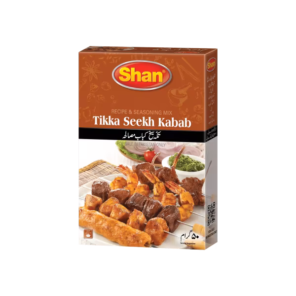 Shan Tikka Seekh Kabab provides a perfectly balanced spice mix for making flavorful and tender seekh kebabs. The spice blend is tailored to create an irresistible taste that complements the texture of the meat, whether youre grilling, frying, or baking. Order Shan Tikka Seekh Kabab 45g Single Pack and enjoy perfectly spiced seekh kebabs!