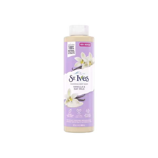 St. Ives Body Wash Vanilla and Oat Milk Pampering soothes skin with a creamy lather and warm vanilla scent. Oat milk helps moisturise and calm dry skin. Ideal for a comforting shower routine. Shop St. Ives Body Wash Vanilla and Oat Milk Pampering 650ml and pamper your skin!