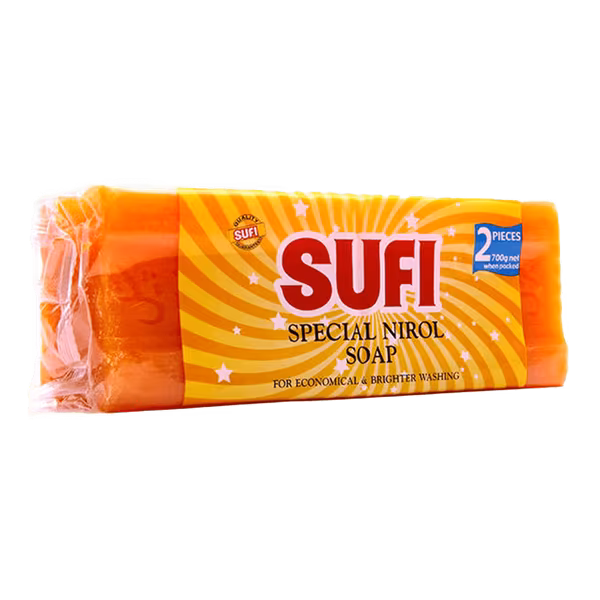 Sufi Detergent Soap Special Nirol 350g Pack of 2 offers excellent cleaning for tough stains, while maintaining fabric softness and freshness. Perfect for everyday laundry needs. Order Sufi Detergent Soap Special Nirol 350g (Pack of 2) for clean, soft, and fragrant clothes!