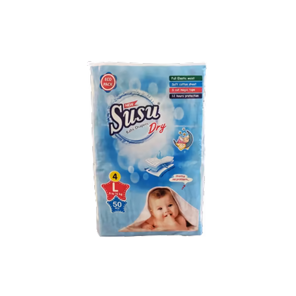 Susu Dry Baby Diapers provide long-lasting dryness and comfort for babies. With superior absorbency, they keep your child protected throughout the day. Buy Susu Dry Baby Diapers Size 4 (50 Pcs) for gentle baby care!