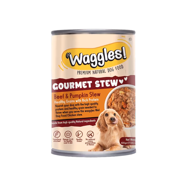 Waggles Dog Food Beef & Pumpkin Gourmet Stew is a premium, slow-cooked meal with tender beef and wholesome pumpkin. Packed with high-quality protein for muscle maintenance and fiber for digestion, it's perfect for adult dogs of all breeds. Get Waggles Dog Food Beef & Pumpkin Gourmet Stew 400g for a tasty, nutritious meal your dog will love!