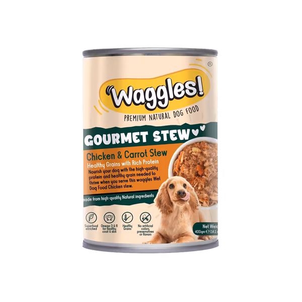 Waggles Dog Food Chicken & Carrot Gourmet Stew is a premium meal made with succulent chicken and sweet carrots, providing balanced nutrition and great taste for your dog. Shop Waggles Dog Food Chicken & Carrot Gourmet Stew 400g for a wholesome and delightful meal your dog will enjoy!