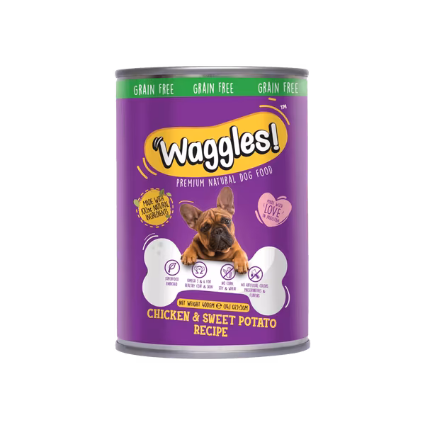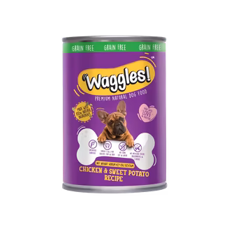 Waggles Dog Food Chicken & Sweet Potato is a 100% natural, grain-free recipe made with lean chicken and sweet potatoes. Enriched with kelp, turmeric, and Omega 3 & 6 for healthy skin, it's perfect for dogs of all ages and sizes. Free from fillers, preservatives, and artificial coloring. Buy Waggles Dog Food Chicken & Sweet Potato 400g online for a nutritious, tasty meal!
