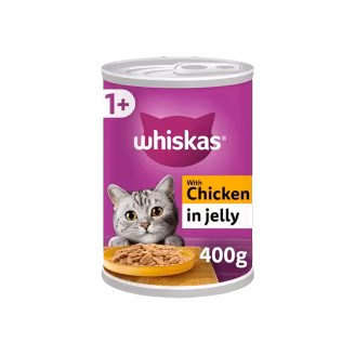 Whiskas Cat Food Can Chicken in Jelly provides a tasty meal with tender chicken pieces in savory jelly. This balanced and nutritious food is ideal for cats that love the taste of chicken and a moist meal. Order Whiskas Cat Food Can Chicken in Jelly 400g and give your cat a meal they'll love!