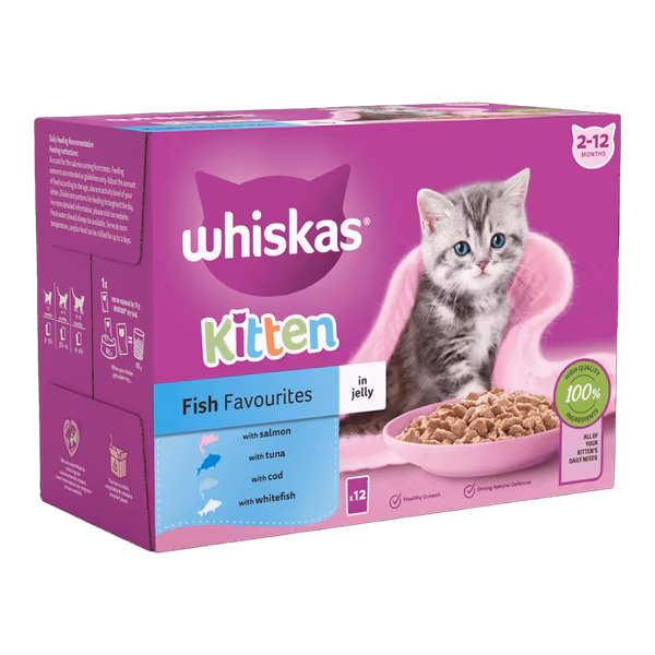 Whiskas Kitten Food Pouches Fish Favourites in Jelly is specially formulated for kittens, offering a mix of fish favorites in a savory jelly. This balanced food helps support the growth and development of your kitten. Order Whiskas Kitten Food Pouches Fish Favourites In Jelly 85g (12 Pieces) and provide your kitten with a tasty and nutritious meal!